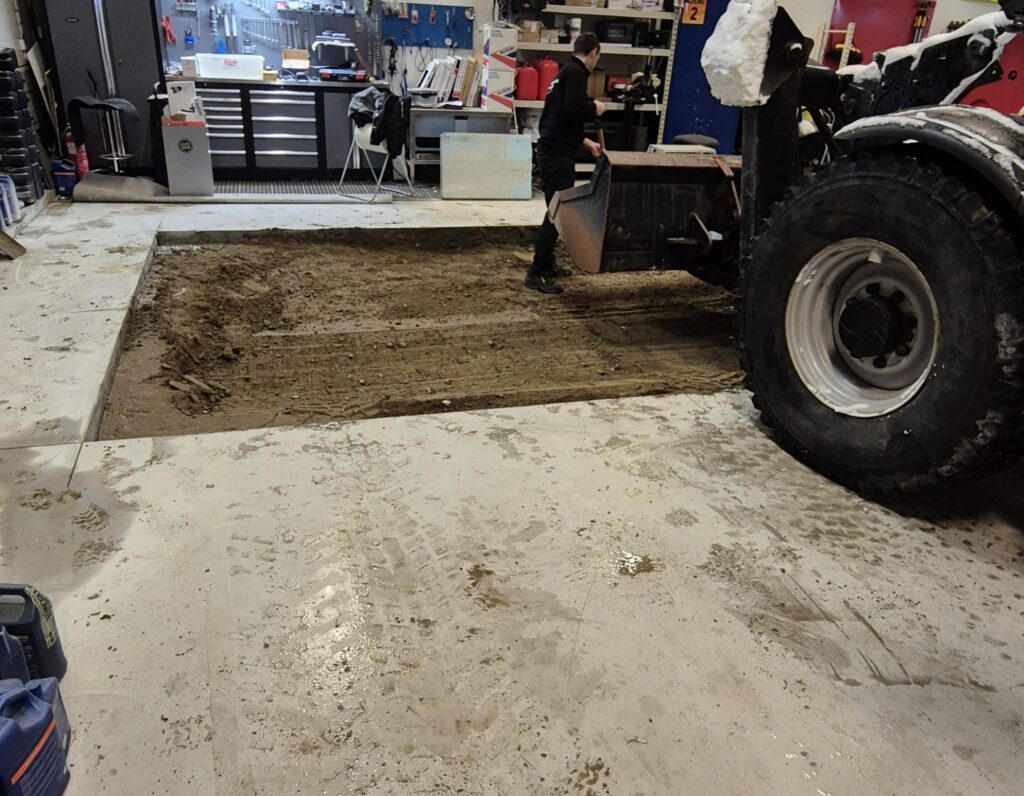 Vi er i gang med å montere en ny og kraftigere løftebukk på verkstedet. For å sikre stabil og trygg drift oppgraderer vi samtidig med sterkere og tykkere betongfundament.