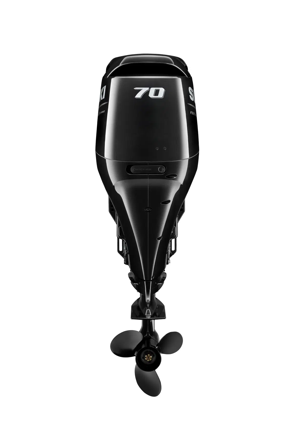 DF70ATL med Suzukis avanserte “Lean Burn” kontrollsystem får du markedets laveste bensinforbruk! Suzukis New Generation 4-takter! Med Kompakt design, Lean Burn Control System, smidig girskift, Suzuki Easy Start, samt ny type trim og tilt. Alle Suzukis påhengsmotorer fra DF40ATL til DF350ATX har selvjusterende kamakselkjede som løper i oljebad, noe Suzuki er alene om blant leverandørene av utenbordsmotorer. Kjedet er utstyrt med en hydraulisk strammemekanisme som er vedlikeholdsfri. Suzuki påhengsmotorene har en moderne design. Øvrige tekniske finesser: Selv-justerende kamaksel/registerkjede: Kamakselkjedet passerer et oljebad slik at man ikke trenger å smøre det ytterligere. Registerkjedet er utstyrt med en automatisk, hydraulisk kjedestrammer som sørger for at kjedet har optimal stramming til enhver tid som igjen gjør det vedlikeholdsfritt. Anti-korrosjonsbehandling: Spesialbeskyttelse blir påført aluminiumsoverflaten med et sterkt ”lim” for å beskytte utvendige deler i aluminium. Fordeler ved dette er at korrosjonsbeskyttelsen bidrar til å øke motorenes totale holdbarhet. Tiltbegrensingssystem: forhindrer at motoren vipper for langt opp. Fordeler ved dette er at det forhindrer skade på båt og motor nettopp på grunn av at motoren ikke vippes inntil båten. Vanndeteksjonssystem: Dette systemet beskytter motoren mot vann i drivstoffet ved hjelp av et drivstoffilter som registrerer vann. Systemet varsler føreren med visuelle varsler og lydsignaler ved vann i drivstoffet. Fordelen ved dette er å unngå vann i drivstoffet, et problem som kan forårsake bl.a. dårlig forbrenning, lav ytelse og korrosjon. Ferskvannsspylesystem: En kobling for bruk av vannslangen som gjør at man kan spyle ferskvann gjennom motorens kjølekanaler. Fordelen er at dette er en enkel måte å stoppe korrosjon på og man trenger ikke engang starte motoren. Offset drivaksel: Motorhodet er plassert nærmere fronten, for å flytte påhengsmotorenes tyngdepunkt fremover. Fordelen ved dette er mindre vibrasjon, mer kompakt størrelse og stabil styring. 2-trinns nedgiringskonsept: Dette systemet med offset drivaksel har førstetrinnsreduksjon mellom veiv- og drivakselen, og andretrinnsreduksjon inne i girhuset. Dette designet gjør det mulig å ha et større utvekslingsforhold, slik at motoren kan dreie en propell med større diameter. Fordelen ved dette er høy fremdriftseffektivitet med propell med stor diameter, raftig fremdrift hvor propellrotasjonen holdes ved like selv med stor last og at propeller med stor diameter dreies med stor kraft, slik at du kan akselerere hurtig. Easy-start system: Bare vri nøkkelen og slipp, og starteren blir stående innkoblet til motoren starter. Dette systemet gir en jevnere start av motoren. Lean Burn: Lean Burn-forbrenningssystemet tilfører motoren den optimale blandingen av drivstoff og luft avhengig av tilstanden. Fordelen med dette gir betydelig forbedring i drivstoff økonomien i alle fartsregister, spesielt ved marsjfart.